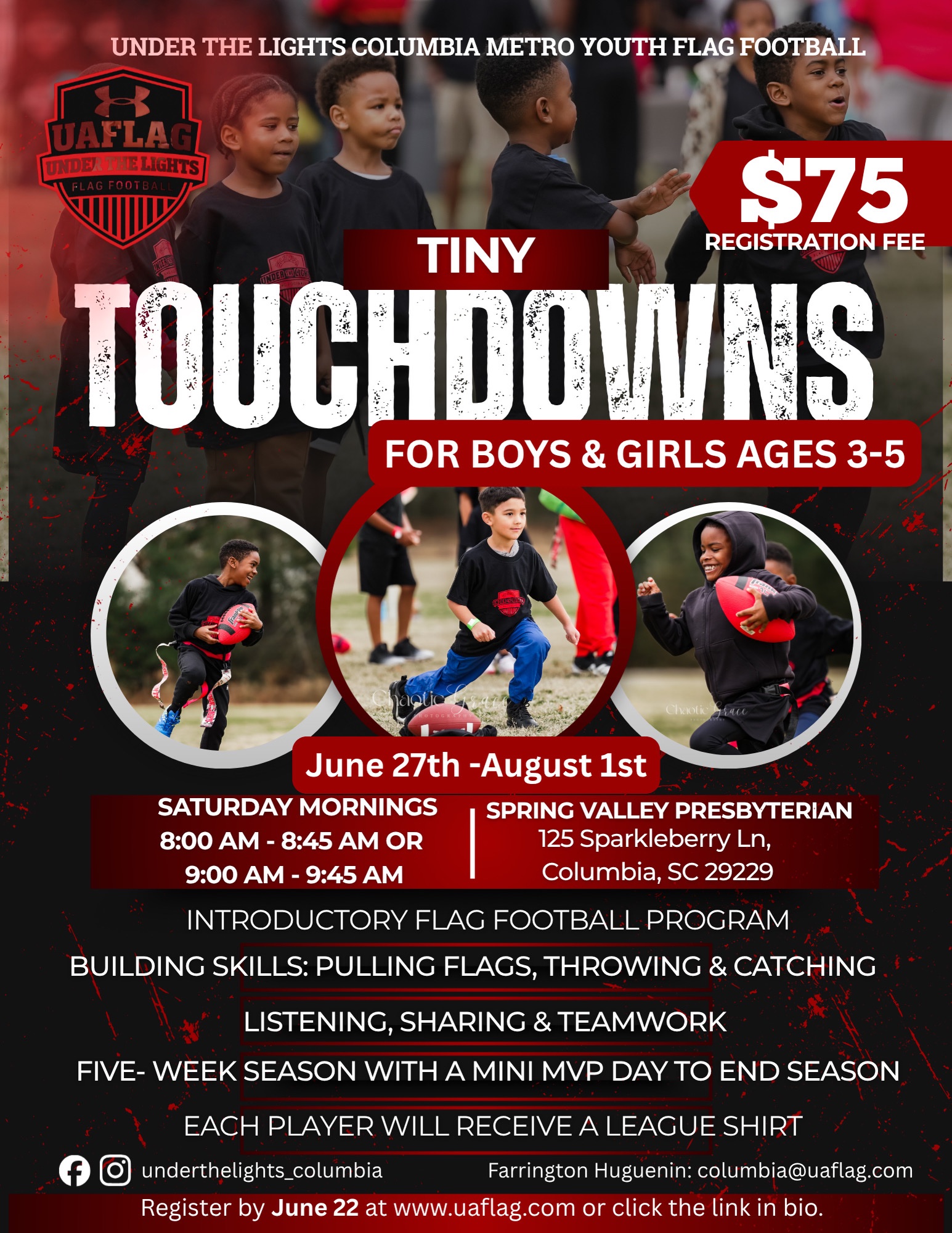 UTL Tiny Touchdowns is an ideal fit for families with boys and girls ages 3–5 who are looking for a fun, low-pressure introduction to flag football. This 5U recreational program is perfect for young athletes who are new to sports or want to build foundational skills in a supportive, energetic environment. Participants gain confidence, coordination, and social skills while learning the basics of running, throwing, catching, and teamwork—all through engaging, play-based activities. If you want your child to experience the excitement of being part of a team, develop important life skills, and have fun along the way, Tiny Touchdowns is a great choice. We welcome all skill levels and focus on making sports a positive experience for every child. Feel free to register or reach out if you have any questions—we’re here to help!